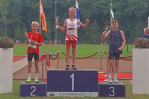 AKU atleten Siem Verlaan en Nina de Lange op het podium tijdens Nationale A-Games 2025